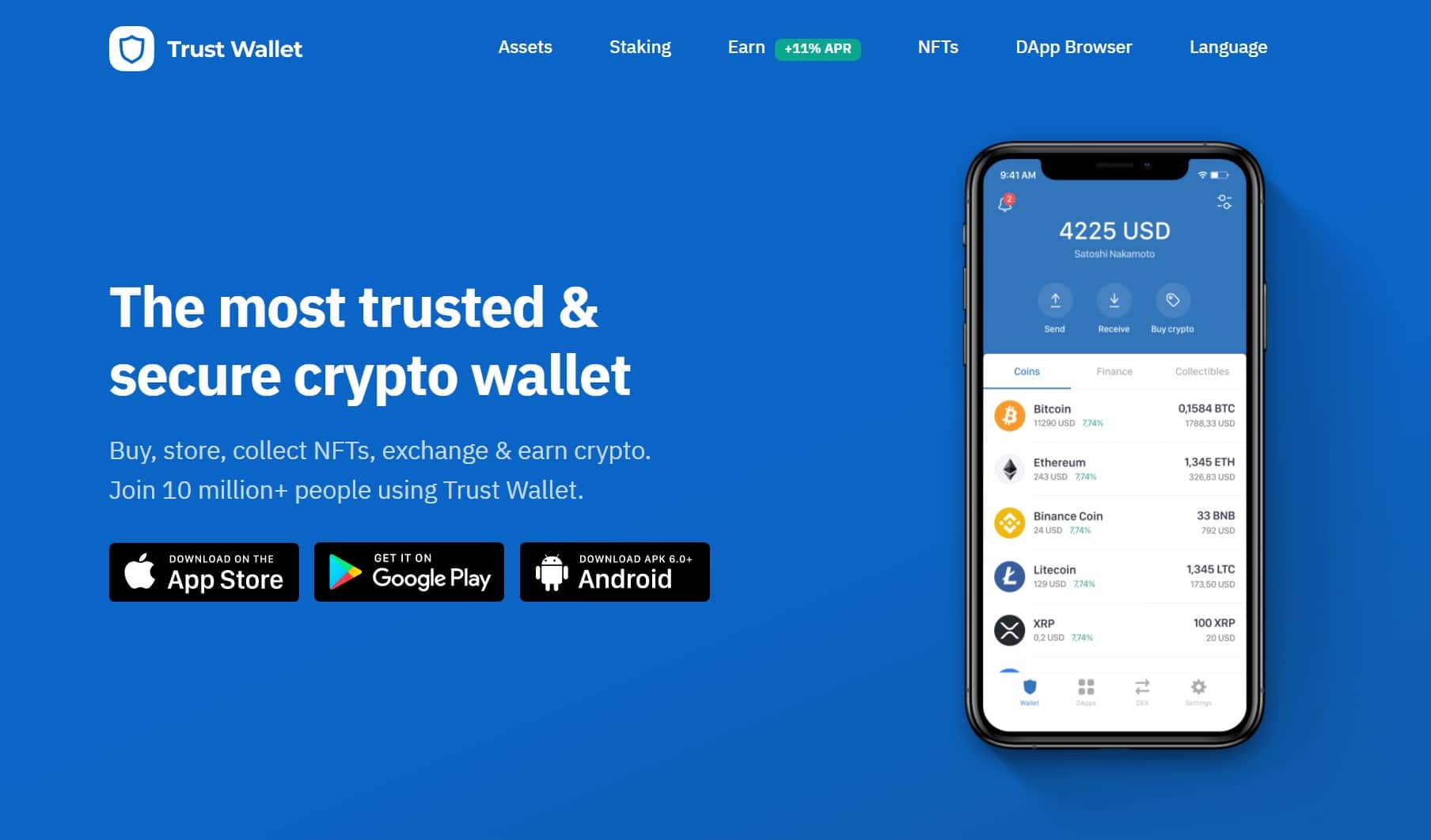 Next, we have Trust Wallet. Trust Wallet was purchased by Binance in 2018, adopting them as the official Binance wallet in response to Coinbase creating their own wallet. Being backed and supported by one of the biggest companies in crypto catapulted Trust Wallet to mass adoption, being used confidently by over ten million users worldwide.