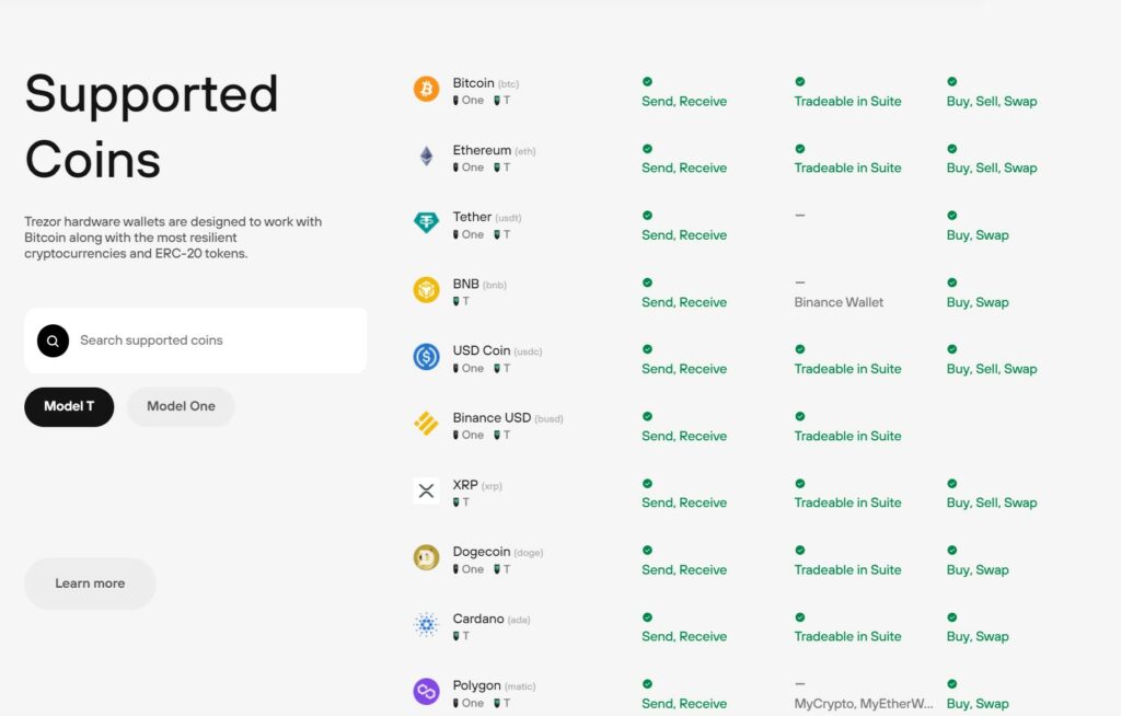 A Look at Some of the Supported Assets. Image via TrezorTake a look at the Trezor Model T Supported Coins page for a full list.