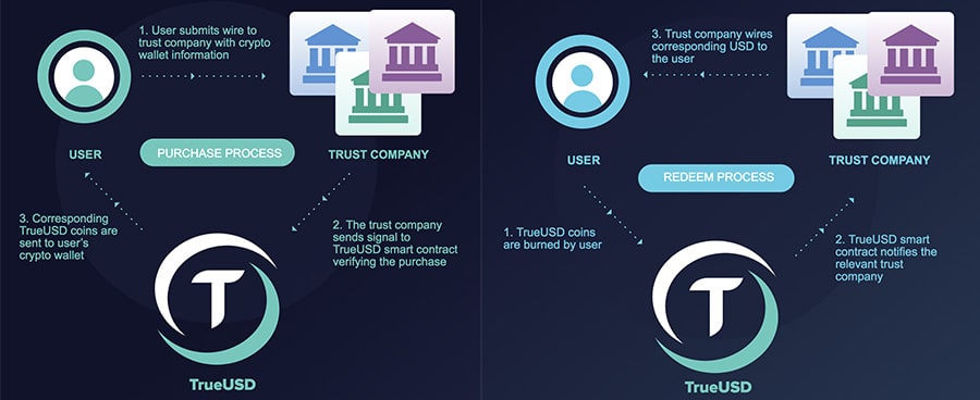 The TrueUSD works through the use of Ethereum smart contracts on the Ethereum blockchain. Through these smart contracts, it is able to issue and redeem a tokenized version of the U.S. dollar.