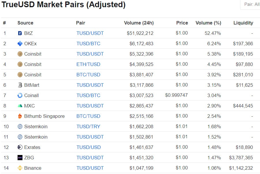 - There is excellent liquidity for the TUSD, with the token trading on dozens of different exchanges, including the largest such as Binance and MXC.