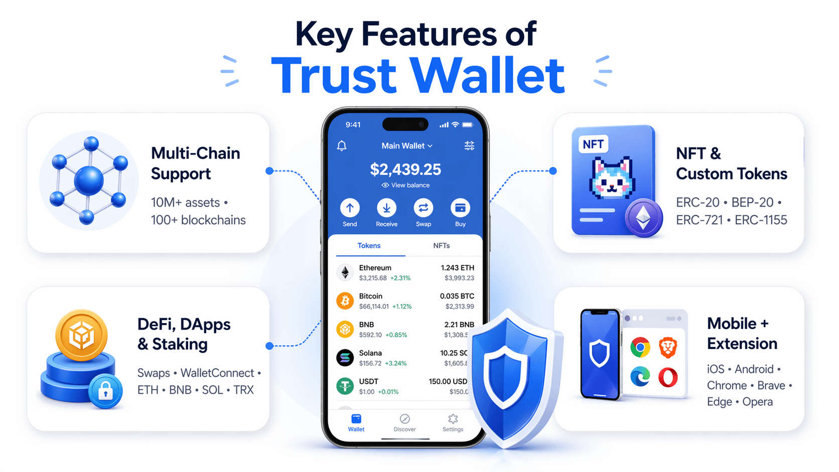 Trust Wallet is a self-custodial, multi-chain crypto wallet that lets users store, send, receive, and manage digital assets across 100+ blockchains. It is available as a mobile app and a browser extension, and it also gives users access to swaps, staking, NFTs, and DApps through the same interface. In simple terms, it works more like a personal safe than a bank account: you control the access, which gives you more freedom, but also more responsibility.