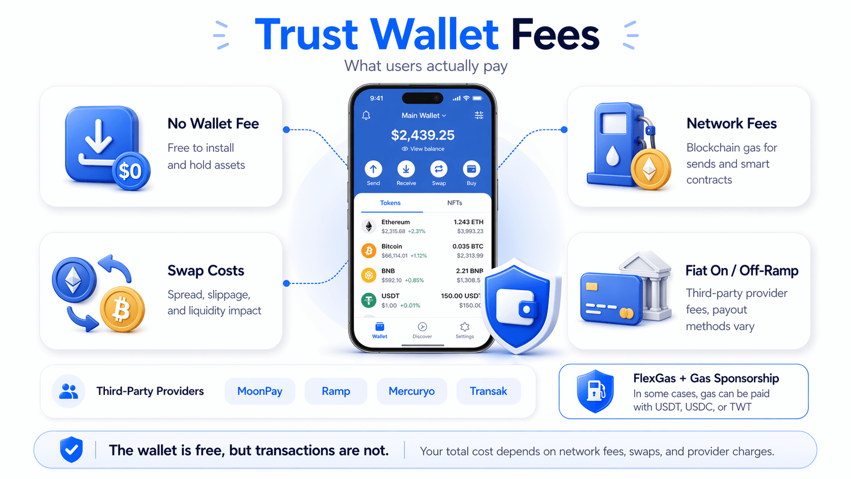Trust Wallet itself is free to download and use, but using the wallet is not the same thing as transacting for free. In practice, users typically run into three cost buckets: network fees, swap costs, and fiat on-ramp or off-ramp charges. The easiest way to think about it is like online travel booking: the app may be free, but the ticket, payment method, and conversion costs still matter.