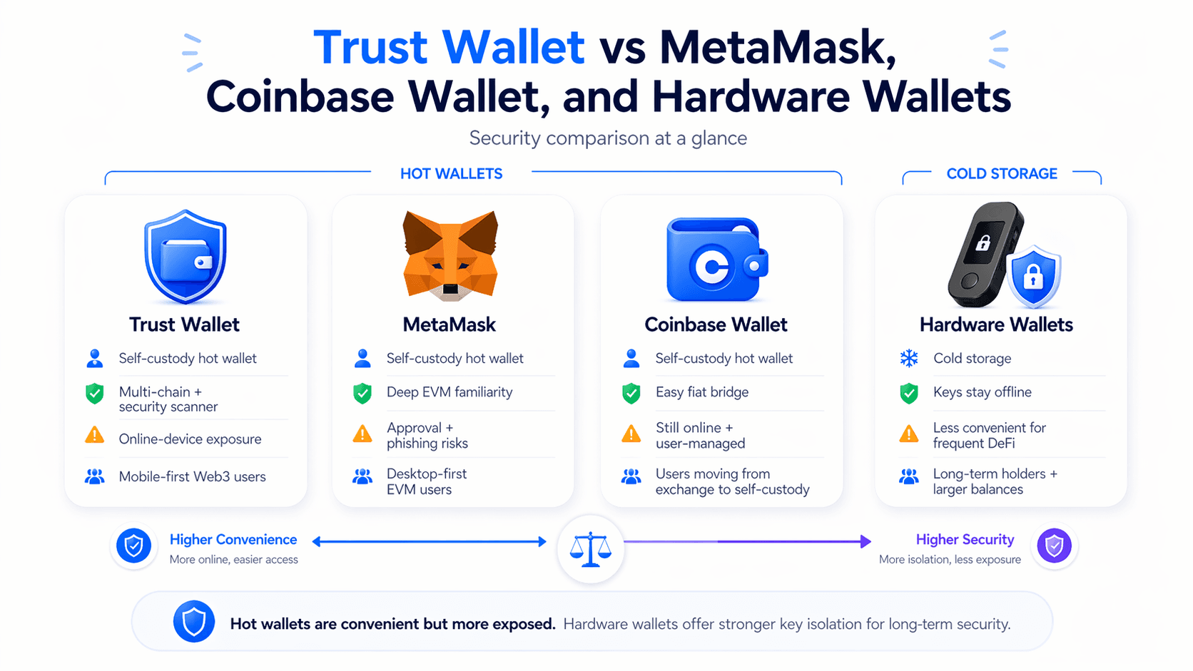 Trust Wallet, MetaMask, and Coinbase Wallet All Sit in the Same Broad Category: Self-Custody Hot WalletsSecurity Comparison at a Glance