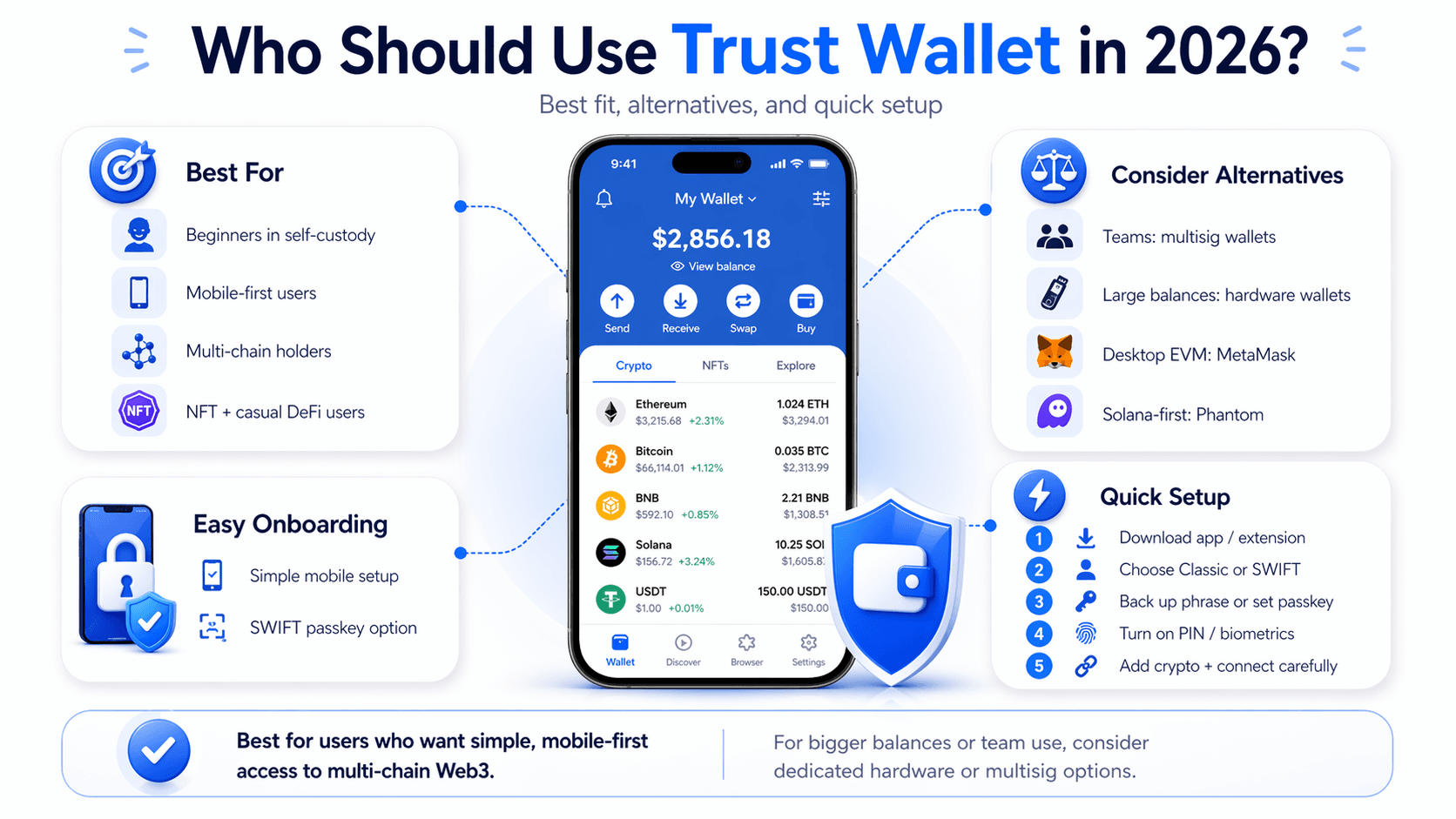 Trust Wallet makes the most sense for users who want broad chain support, a simple mobile setup, and direct access to Web3 tools without relying on a centralized exchange. It is not the right wallet for everyone, but it does fit a clear type of user.