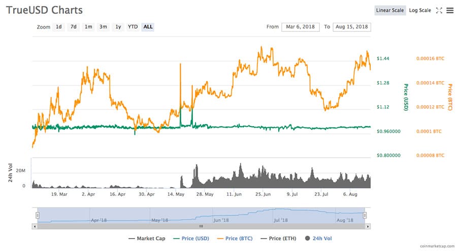 The TrueUSD was created as a peg to the U.S. dollar, which means it should always trade at $1, and in a perfect world it would. However we don’t live in a perfect world. As of mid-August 2018 one TUSD is being quoted at $1.01 on Coinmarketcap.com, and over the past few months has traded as low as $0.98 each. In general the USD price remains around $1, but the Bitcoin price has seen a wider variation by far.