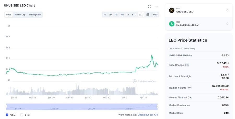 By February 2021 the token was part of the cryptocurrency rally taking place at the time, which allowed it to surge to an all-time high of $3.92 on May 14, 2021. Since then the price has deflated by roughly 35% as the entire market has entered a bearish phase. On June 10, 2021 the LEO token trades at $2.43 and is the 49th largest cryptocurrency with a market capitalization of almost $2.4 billion.