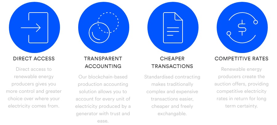 It uses smart contracts and allows participants to finance new green energy projects, invest in existing green energy projects, or procure green energy for their own use in an efficient, secure and transparent manner. It is also an international marketplace where anyone can trade renewable energy.