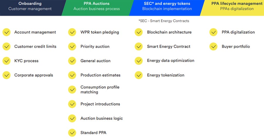 WePower Platform Features. Image via WePower WhitepaperWePower is able to secure data about energy production and consumption through its connection to the energy grid. The platform then tokenizes the data as green energy producers connect to the platform. Investors and traders can buy this energy in the form of WPR tokens, which are created through smart contracts.