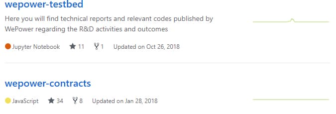 WePower GitHub ReposThere are only two repos here and the last commit took place back in October of 2018. Of course, the team could be developing in private for now but it's unfortunate that the community cannot verify this.