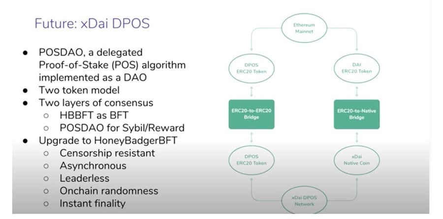 Two token model with two layers of consensus. Image via xDai Chain. There is one final phase to potentially be completed, which is for HoneyBadger BFT Consensus Layer Integration. The Honey Badger consensus algorithm allows nodes in a distributed, potentially asynchronous environment to achieve agreement on transactions.