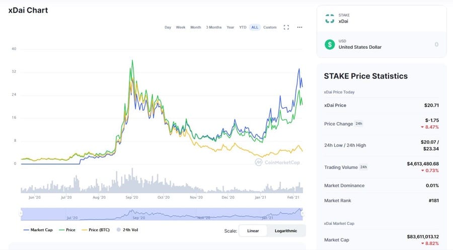 xDai – This is a stable-coin with its value pegged to the U.S. dollar. The stability of xDai allows for predetermined fees that are extremely low in comparison with many other blockchains. Users benefit from stable balances and stable gas fees, and these features also make the xDai Chain more scalable. Plus, it benefits from the massive $1.9 billion market capitalization of Dai.
