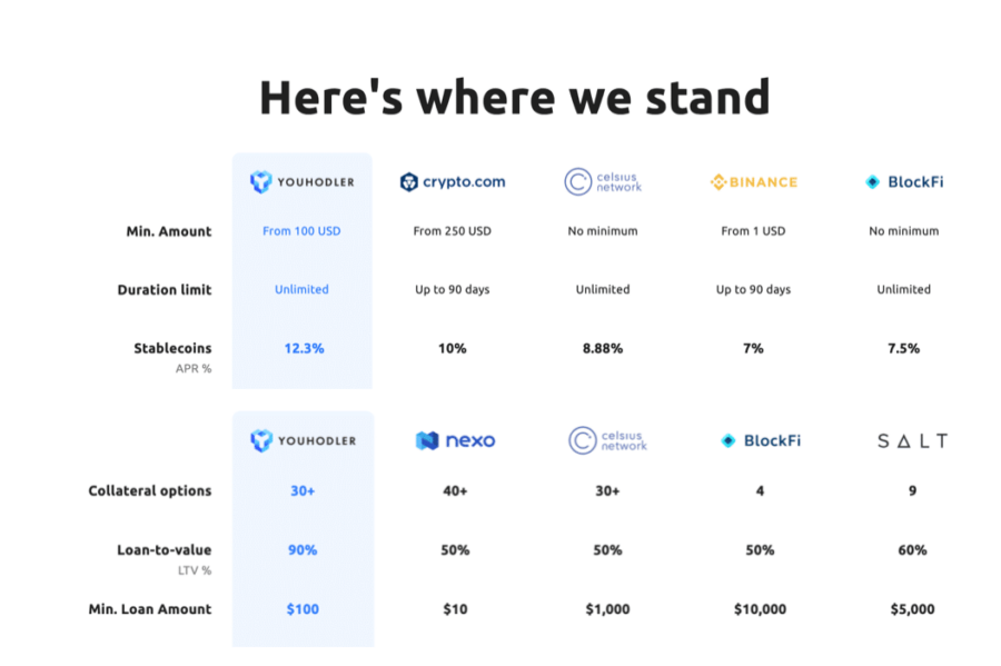 When in doubt, shop around Since this chart was compiled by YouHodler, it is reasonable to find that it paints the platform in a fairly flattering light. Despite that, it also knows it's not the best in everything and probably doesn't try to be. With the two unique products it offers, it has confidence enough to capture the number of users it needs to remain healthy and competitive.