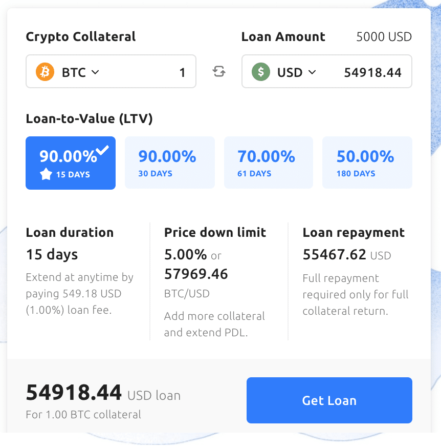 - Loan currency: USD, EUR, CHF, GBP, BTC and Stablecoins
