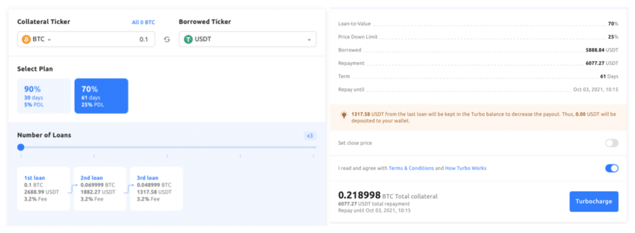 - Set Close Price feature aka Take Profit - Set the price where you want to take profit. Once it reaches that price, part of the collateral is sold to repay the loan and the rest is deposited into the account. This can be defined upon applying for the loan or for the duration of the loan.
