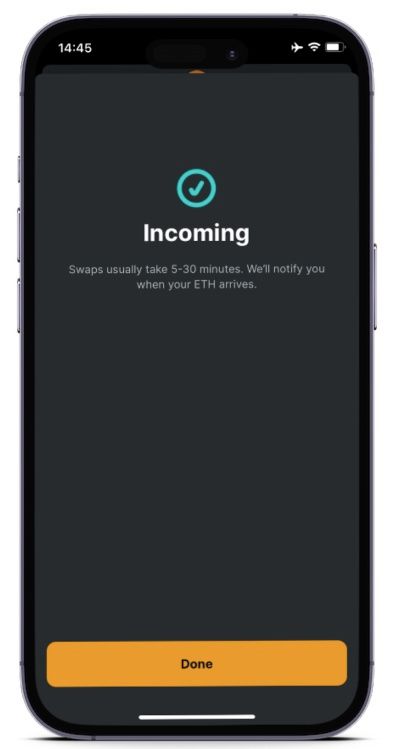 Zengo wallet does a great job here, better than most I've reviewed. Here is a look at a Bitcoin to Ethereum swap on Zengo, informing the user that it can take up to 30 minutes for the ETH to arrive: