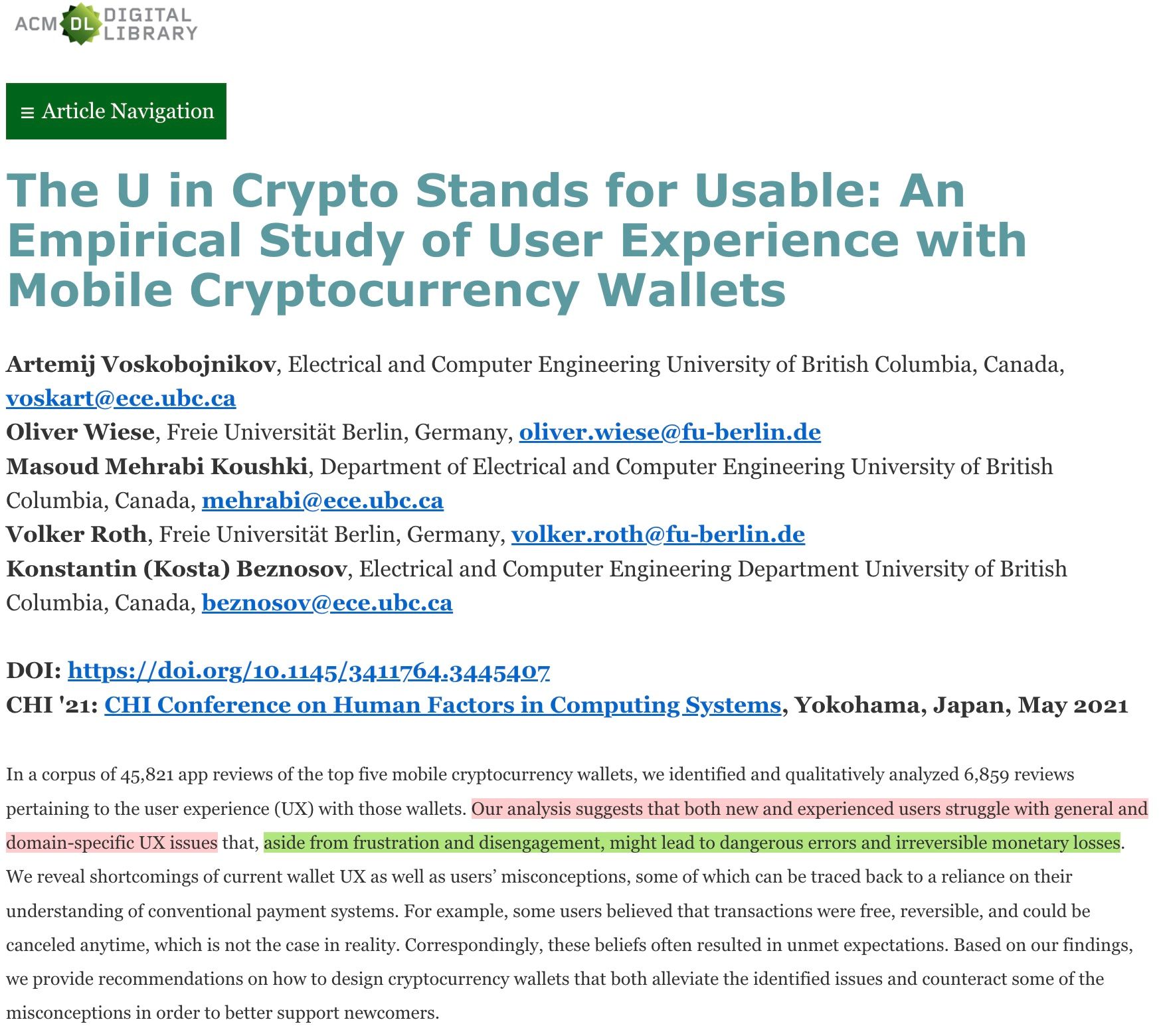 I could go on emphasising our personal experiences with wallets, or reflect on conversations I’ve had with crypto users about their trials and tribulations with self-custody, but instead, I would like to highlight this comprehensive study performed by the world’s largest educational and scientific computing publication, the Association for Computing Machinery (ACM) on their findings: