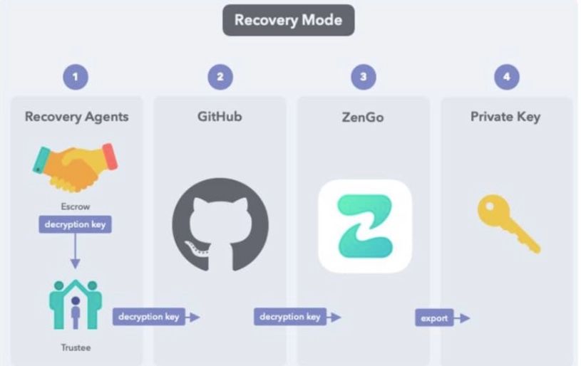 What This Scenario Would Look Like. Users Can Always Recover Their Funds, Even if Zengo Goes Out of Business. Image via ZengoUpon entering recovery mode, the app is able to decrypt the Server Key and recreate the private keys for all the associated coins and addresses.