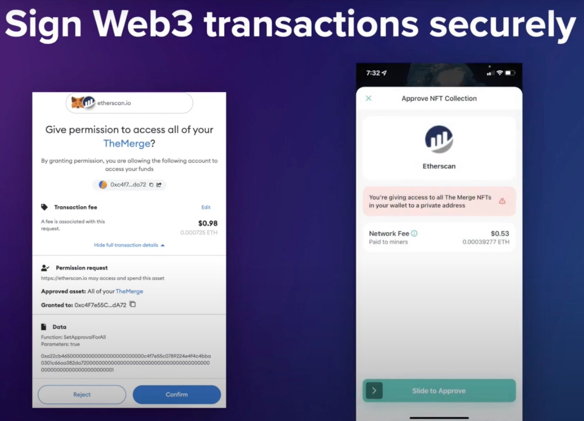 Here is a great image from a Zengo YouTube video showing a MetaMask transaction on the left that would result in a user unknowingly giving all their NFTs away, vs how the same transaction would look in Zengo, with a clear warning of what is about to happen: