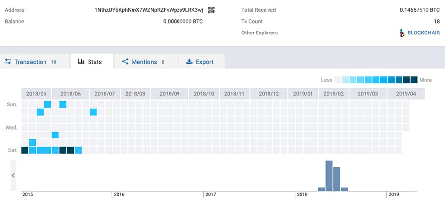 Historical wallet statistics in chart form on BTC.comOne unique data set on BTC.com is how many times a public Bitcoin address is mentioned on the internet. In addition to Bitcoin data, you can also explore Ethereum and Bitcoin Cash at BTC.com.