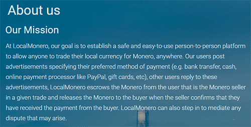 The platform offers similar functionality to Localbitcoins and helps users to securely transact fiat currencies for Monero (XMR).