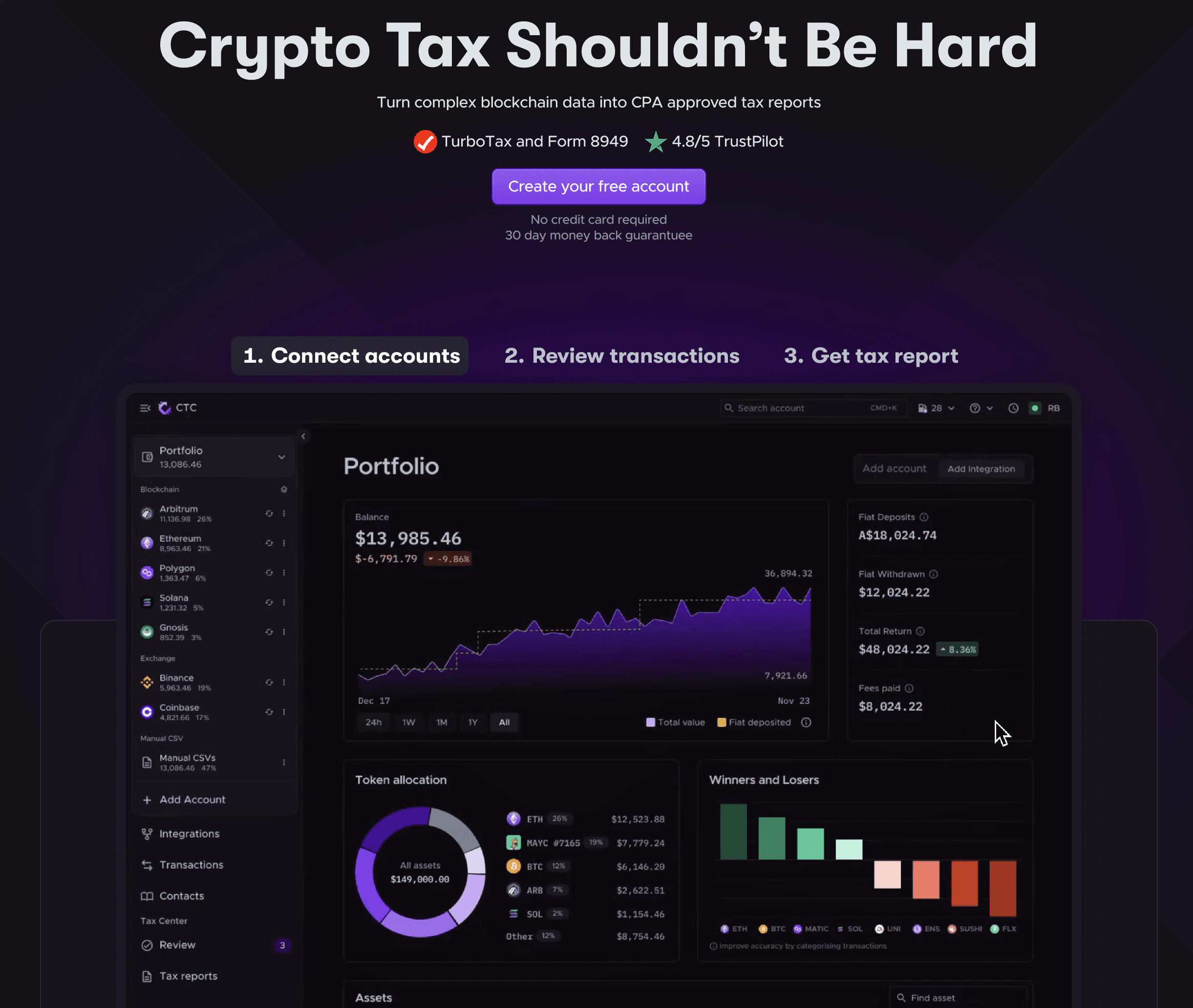 This is a crypto tax solution that makes it simple to manage your taxes at a reasonable price. Plus, it will reduce or eliminate much of the stress associated with crypto taxes and provide reliable and accurate tax reports.