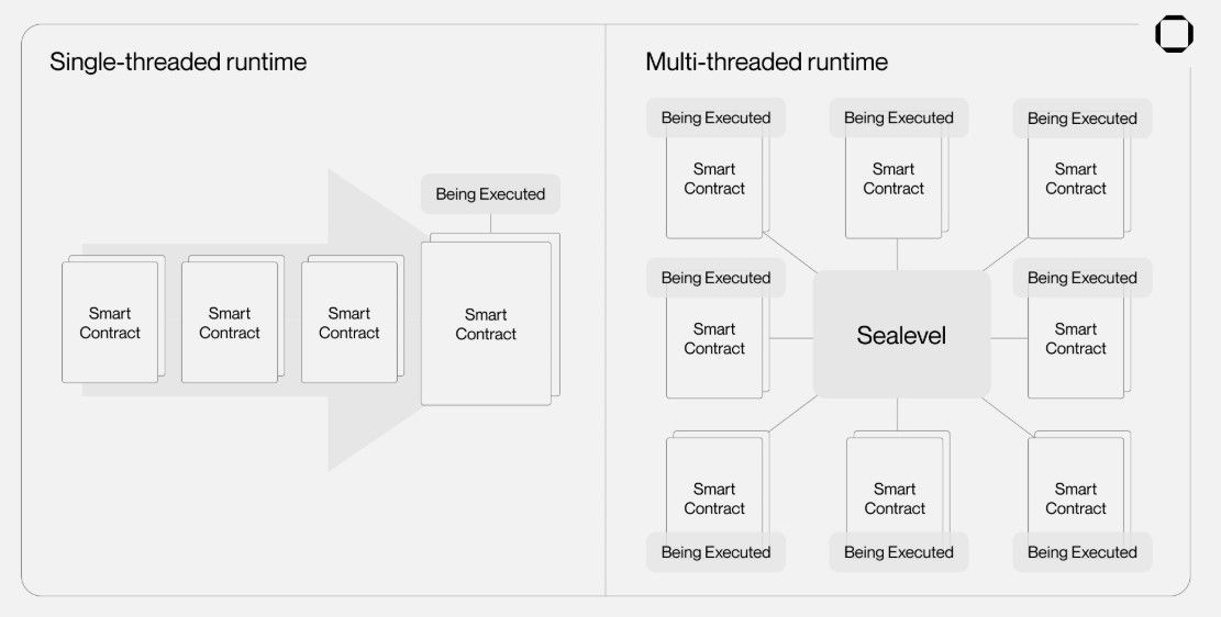 | Execution Model | Single-threaded, stack-based execution – Transactions are processed one at a time in a sequential manner. | Parallel execution via Sealevel – Can process multiple transactions simultaneously, improving performance. |