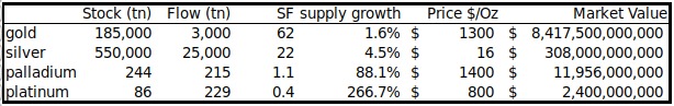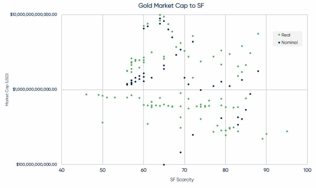 For all commodities or basically all items with a quantifiable amount and a quantifiable production, you can count their stock-to-flow. It is simply to divide the item's stock with its flow. This gives a value that states how many years it would take to produce the amount you have in inventory; for example, gold has an SF of 62, as you can see from the chart. This is what Saifeadean Ammous explained in his book.