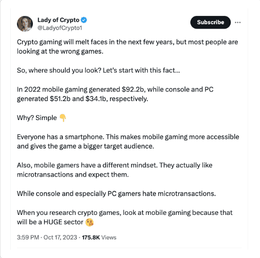 Individuals should closely track crypto game developers and early successes for potential opportunities in the next bull market, especially for mobile. Be sure to closely follow companies such as Playkey, Immutable, Sky Mavis, Wax, Upland and Mythical Games who will be at the forefront of these developments. While the path forward is unclear, the building blocks are emerging for a future where crypto and gaming are seamlessly integrated in interactive experiences, and it is likely Lady Of Crypto is correct in her thinking given the size of the mobile game market.