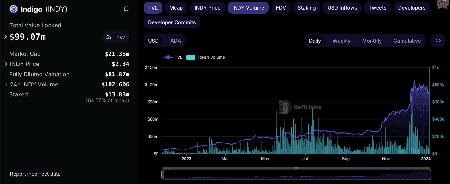Indigo Protocol has seen impressive growth both in terms of TVL and volume, with currently over $99 million in TVL.