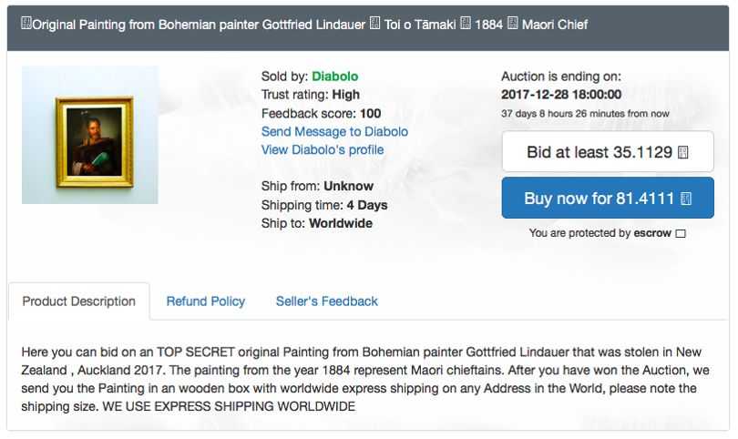 Diabolo, a group that according to a screenshot posted on the landed page for the White Shadow Market, is "biggest Europe Weapon Dealer and the number one source for valuable and rare stuff" has posted a stolen painting with an asking price of 81 Bitcoin. The painting in question is an 1884 piece by artist Gottfried Lindauer. Of the two pieces that were stolen at the same time from a New Zealand art gallery, Chief Ngatai-Raure has appeared for sale on the dark web by itself.