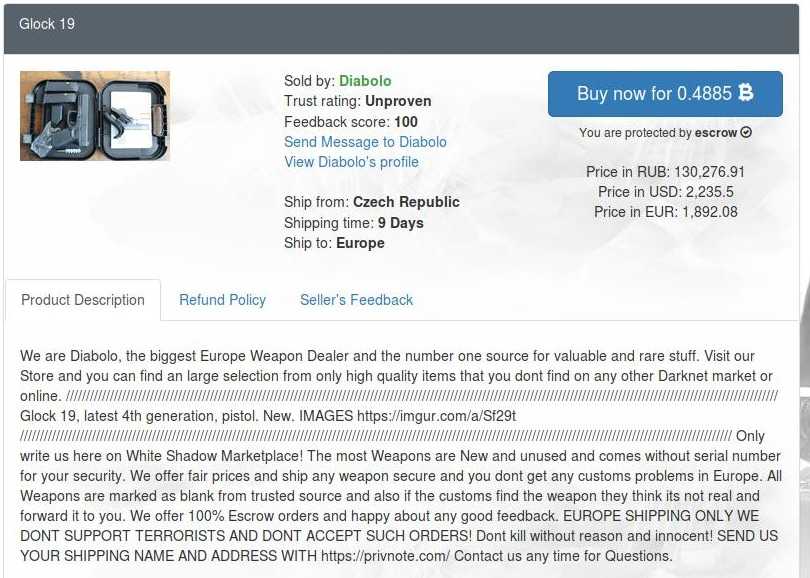 The item is listed by an account called Diabolo. On the main landing page for White Shadow Market (though not the official Tor hidden domain), a screenshot can be seen of an item for sale by Diabolo. The item is a Glock 19 pistol for sale at 0.4885 Bitcoin.