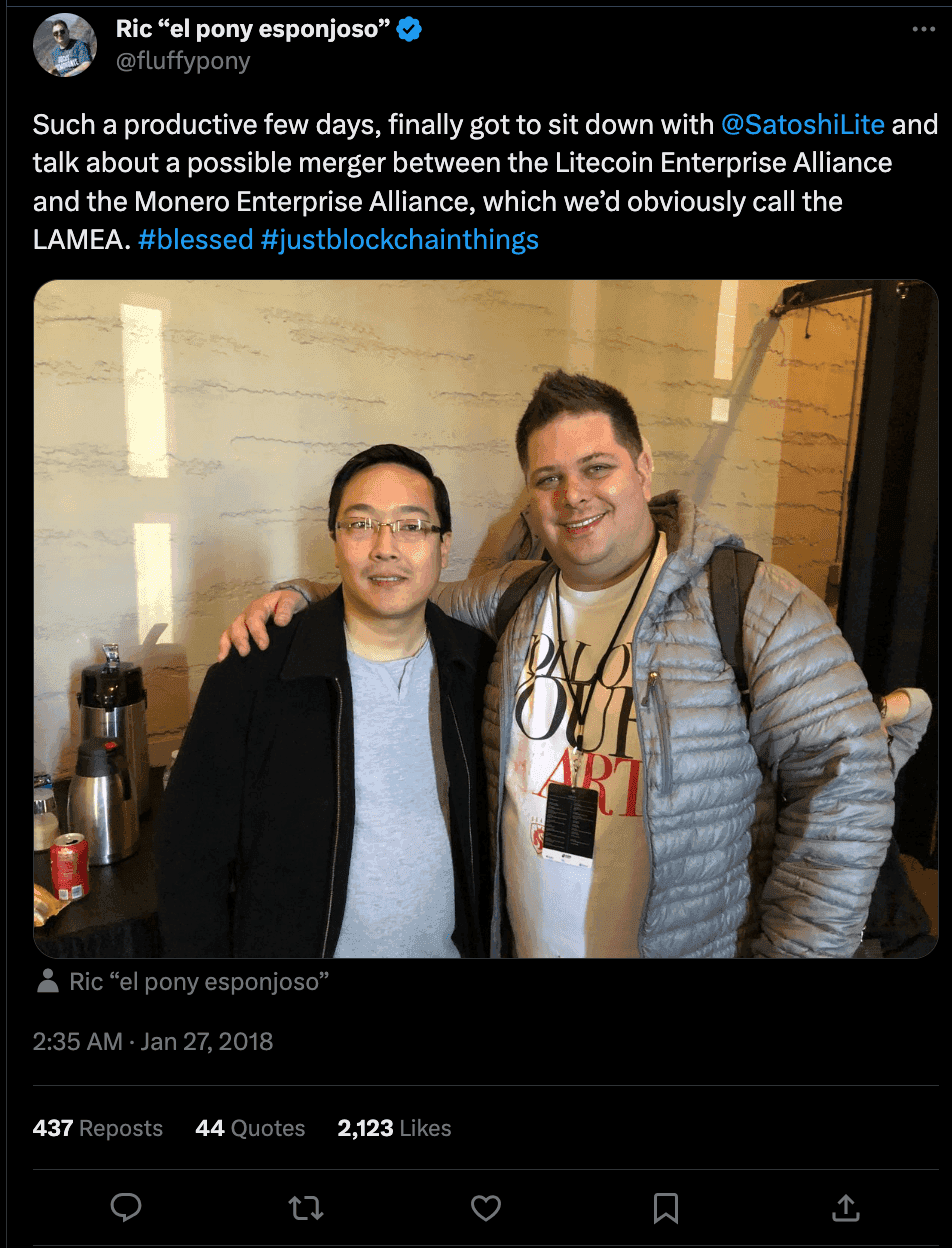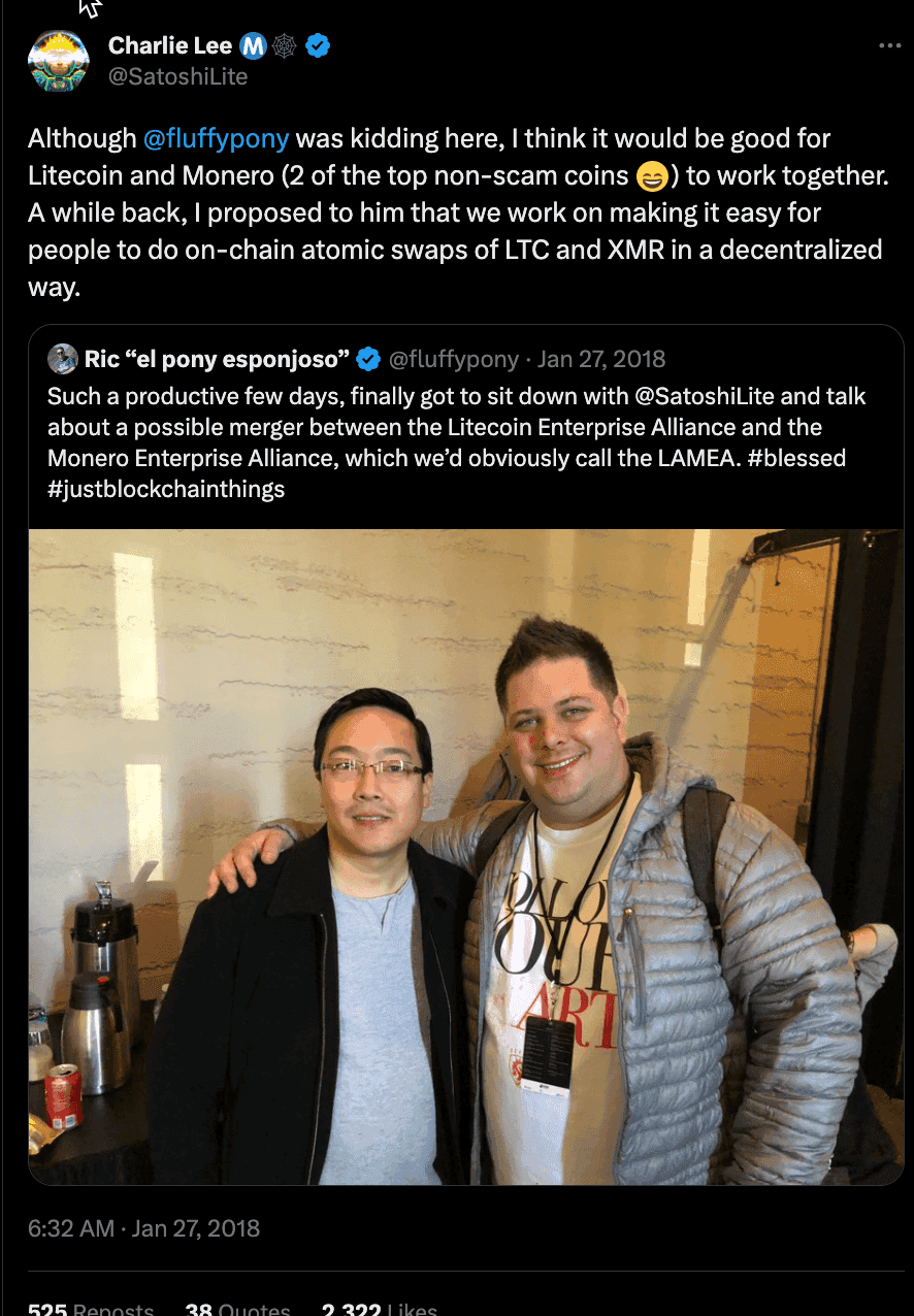 This was all started yesterday when Spagni, who goes by the handle of Fluffypony, posted a picture to twitter with him next to Charlie Lee. They Tweet jokingly alluded to the possibility of a potential merger between the coins.