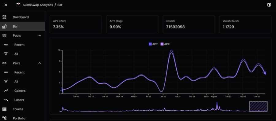 The token was designed to reward early protocol users by allowing them to continue earning a cut of SushiSwap’s fees even after they have stopped providing liquidity to SushiSwap’s pools. This can be done by staking SUSHI to earn more SUSHI on SushiSwap’s Sushi Bar.