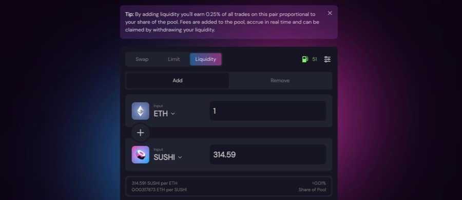 The protocol charges a 0.3% trading fee on the total value of the asset being swapped. 0.25% of these fees go to those providing liquidity in SushiSwap’s Liquidity Pools, and the remaining 0.05% goes to the Sushi Bar pool (more on that in a second).