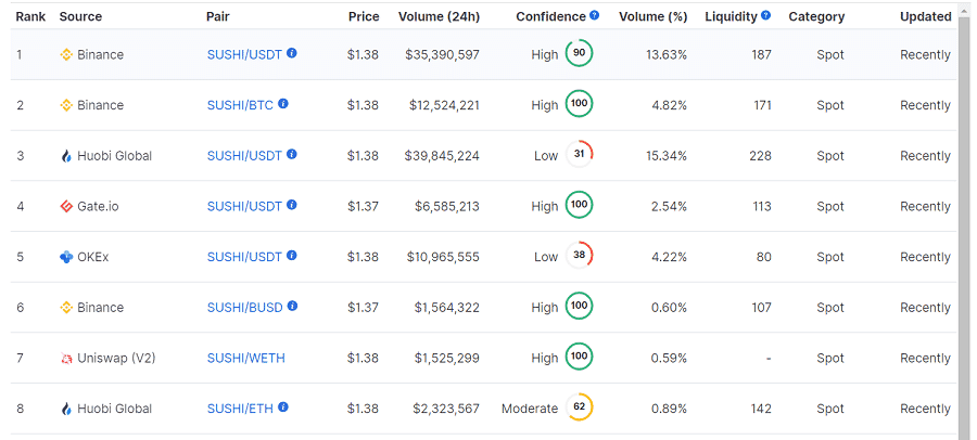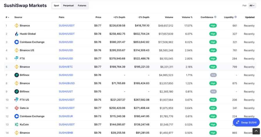 If you prefer decentralized exchanges, SUSHI is still available on Uniswap and can, of course, be purchased from the SushiSwap Exchange. Liquidity on all these exchanges is very high, and the 24-hour trading volume for SUSHI is nearly double its market cap. So you should have no issues getting your hands (or chopsticks) on this succulent cryptocurrency token.