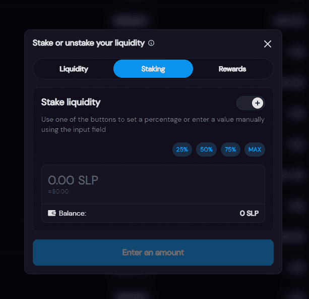 SushiSwap’s Sushi Bar is where you can stake SUSHI tokens to earn more SUSHI tokens. If you wonder where these rewards come from, recall the 0.05% trading fee noted earlier. 0.05% of all trading fees on SushiSwap are added to the Sushi Bar pool in the form of SLP tokens.