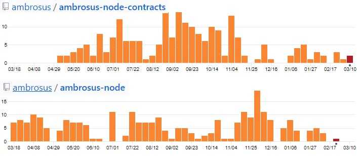 As such, I decided to take a look into the Ambrosus GitHub to get a sense of how the team was coming on with the code commits. Below are the commits for the two most active repositories on the project.