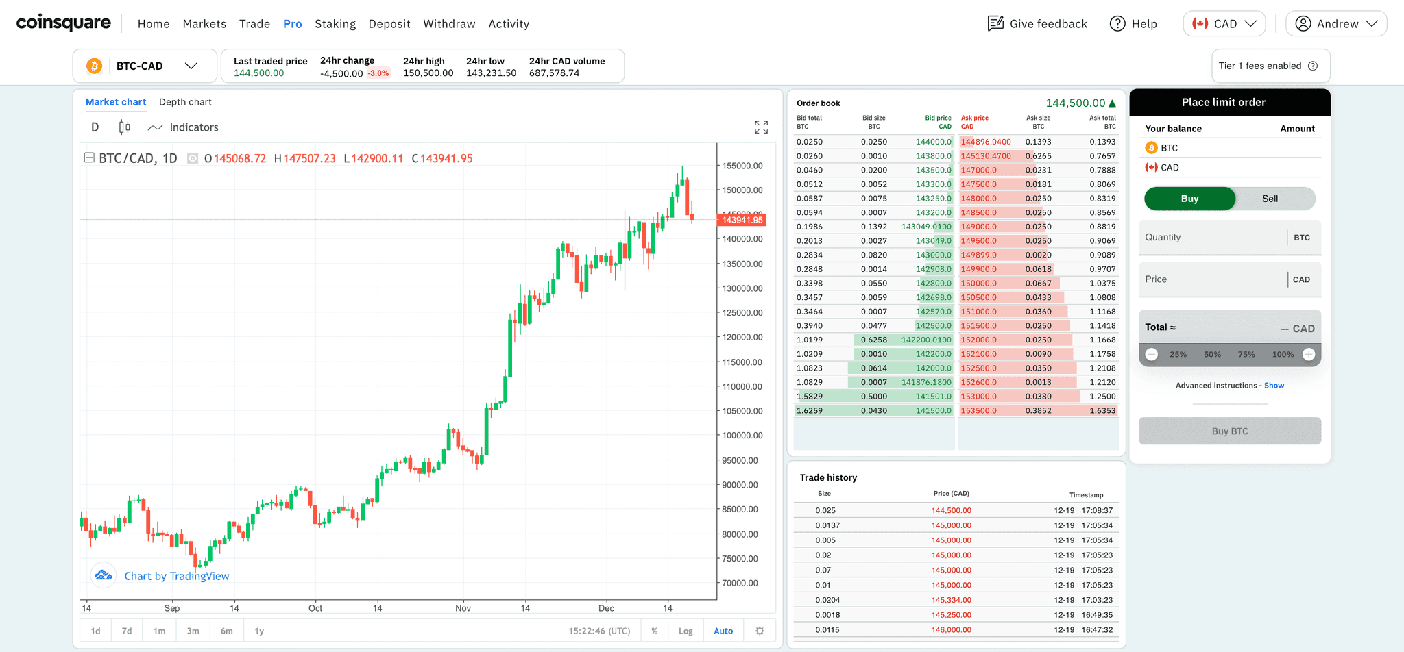 If you take a look at the chart on the left, it will be quite familiar to most traders. This is because the chart is a Tradingview chart. Coinsquare is using the software from this well-known charting package provider. It is also used by a number of other exchanges as their charting software of choice.