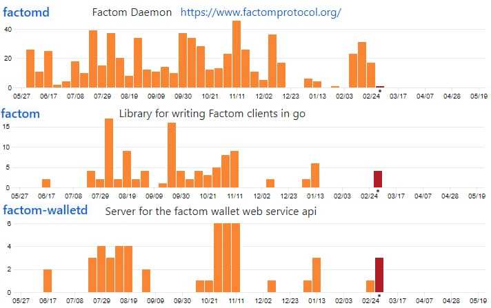 Hence, I decided to jump into Factom's GitHub to check out how much activity there is in their repositories. There are over a hundred repositories but below are the code commits for the top 3 most active repos.