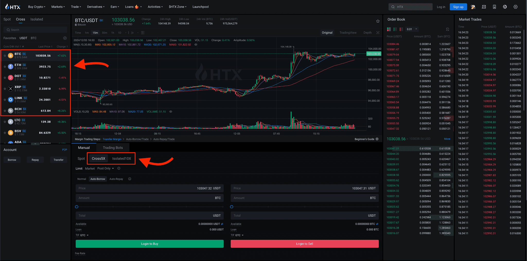 From the trading screen, traders will need to flip between Spot and Margin sections to bounce back and forth between leveraged and non-leveraged tokens, this can be done in two different ways as shown by the red arrows below: