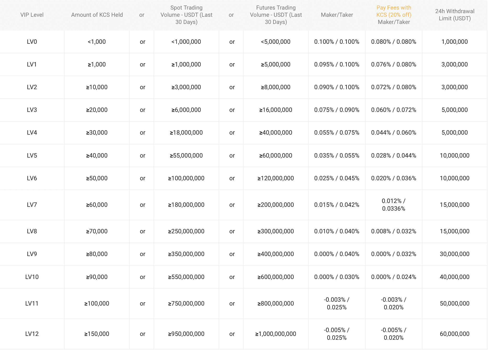 KuCoin is one of the most fee-friendly places for traders, especially among large volume traders and institutions as levels 8 and above start enjoying negative fees, meaning they can earn a profit from Maker trade orders. This attracts traders looking to trade large amounts and increases liquidity on the platform.