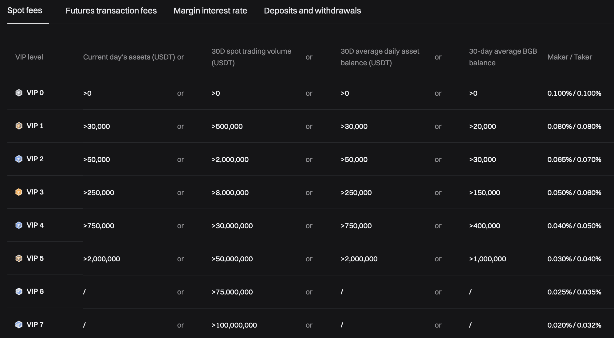 At first glance, the maker fees for spot market from OKX seem to be slightly cheaper than Bitget. However, if you pay with the Bitget token BGB, they're both the same (0.08%). The taker fee for both sits at 0.1% but the BGB token gives the user a small discount, bringing both maker and taker fees to 0.08%. If you'd like a further reduction in fees on OKX, you'd need to be a VIP member, trading at a minimum of USD100k and above to get 0.06% for maker and 0.08% for taker fees.