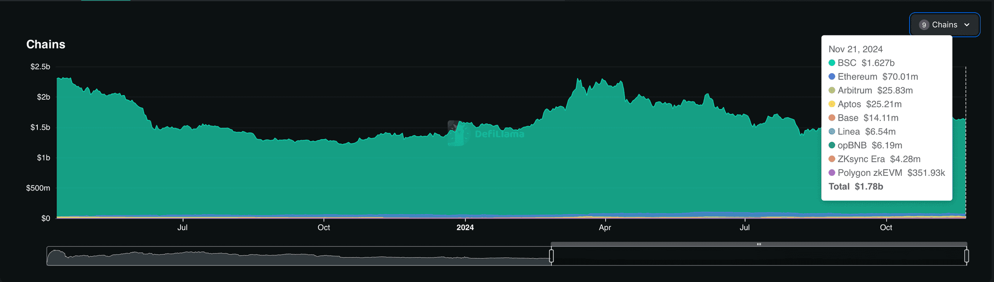 Currently, PancakeSwap stands as the largest decentralized exchange (DEX) and DeFi application on the BSC network by total value locked (TVL), boasting an estimated $1.62 billion in assets held on the platform. The remaining assets are spread across other supported chains, indicating significantly lower adoption on those networks. PancakeSwap also features its own governance token, CAKE, which enables holders to vote on proposals. Additionally, CAKE is distributed as a reward to liquidity providers and stakers.