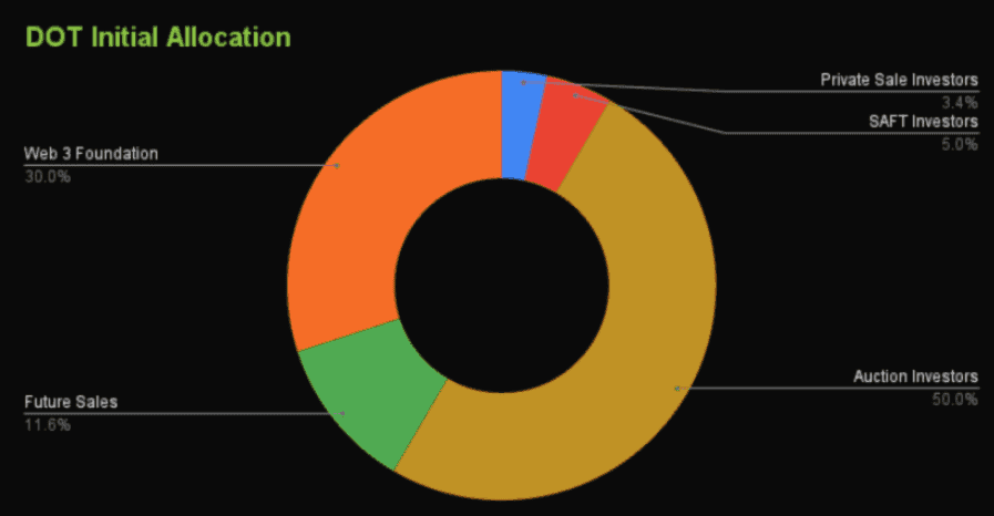 Half of DOT’s initial total supply of 10 million was sold in two rounds to public and private investors (2.25 million and 2.75 million, respectively). The price per DOT token for these funding rounds was initially 28.80 USD.