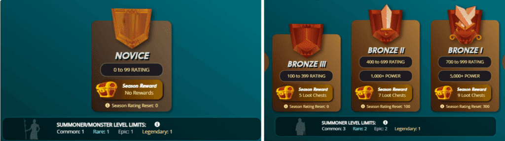 In higher leagues, the change in rules typically involves a mana restriction and disallowing specific summoners, cards or abilities. This added complexity provides a better challenge to the more skilled players of the game.