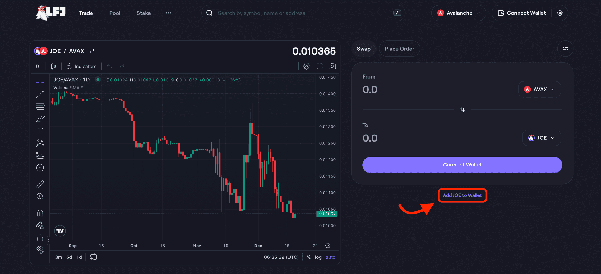 Here's an easy way to add token addresses on LFJ: You can select the token you want to swap for, and again, will see the option to “add token to wallet,” here is an example of how this would look for JOE: